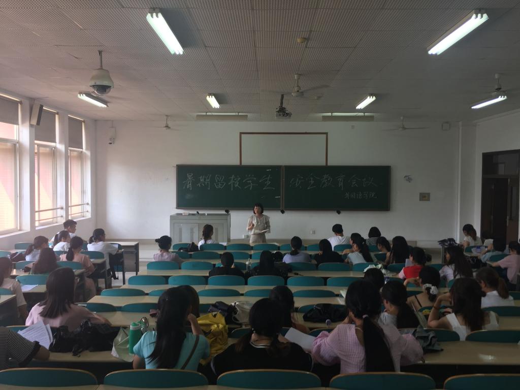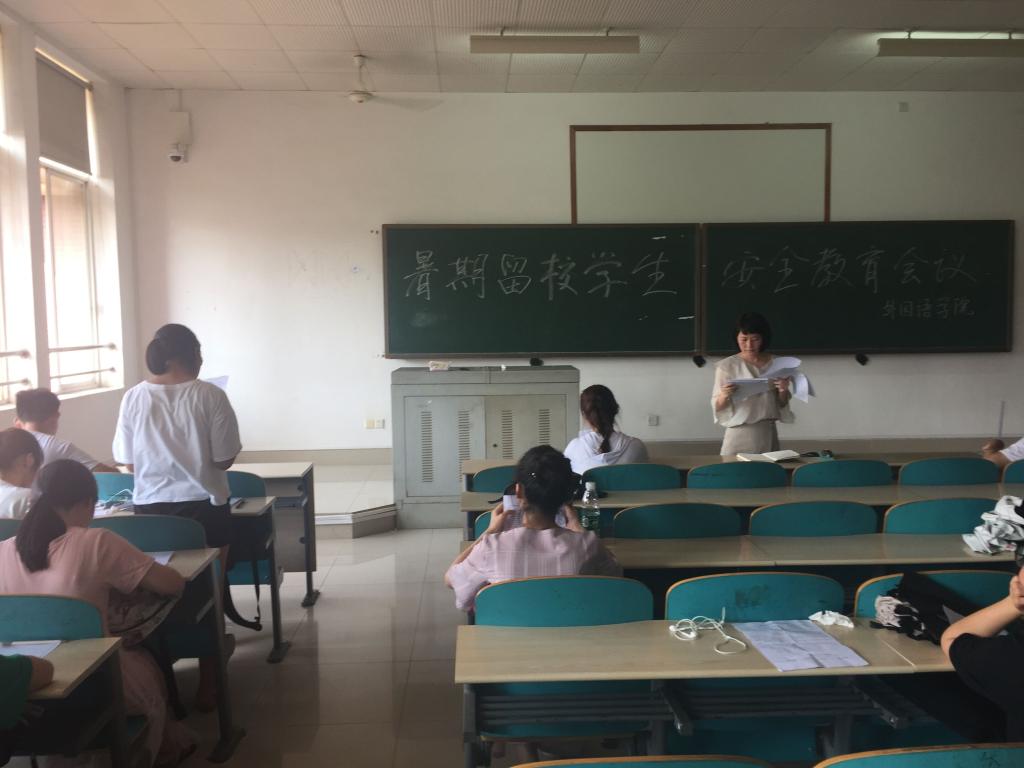 7月16日下午,外国语学院与综合教学楼A307召开2018年暑期留校学生安全教育会议。会议由学工办刘莎老师主持,年级辅导员邹磊和全体暑期留校学生参加了此次会议。