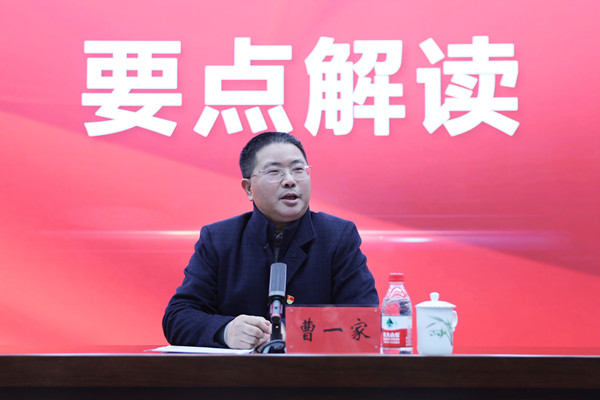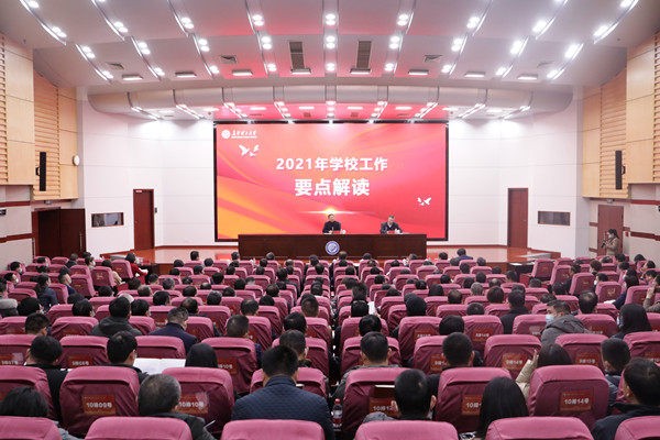 曹一家从深入贯彻习近平新时代中国特色社会主义思想、落实立德树人根本任务、持续巩固学校核心竞争力、优化学校内部治理结构、提升全面建成“百强”大学保障能力等五大方面分20个要点对全年工作进行了详细解读。强调要强化对习近平新时代中国特色社会主义思想和党的十九届五中全会精神的学习贯彻;要做好学校第四次党代会精神和学校“十四五”建设发展规划纲要的宣讲、实施;要广泛开展建党100周年宣讲活动,深入开展党史学习教育和师生“四史”教育活动;要以国家级、省级一流本科专业建设点和一流课程建设为抓手,以优秀教材建设为突破口等措施落实好立德树人的根本任务;要加强应用型、复合型和技术型人才的培养;要围绕国家战略需求和“三高四新”战略开展科研攻关;要通过优化学科结构,抢抓机遇,重点建设好3—5个交叉学科点,实现学校发展“变道超车”。