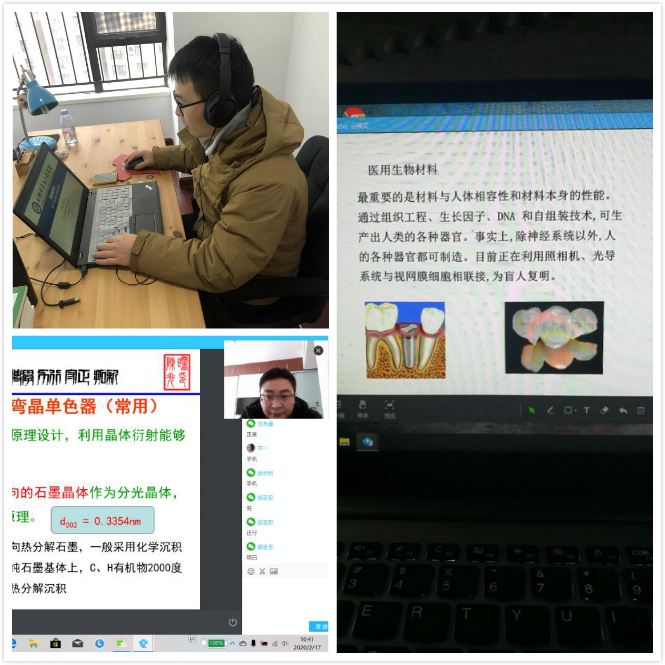 分管科研与研究生培养工作的副院长范金成以学生为中心,全面摸排,同时加强心理辅导,给予有困难学生和应届毕业生特别关注。分管教学的副院长陈曙光以他极高的专业素养及前瞻性,迅速做出反应,通知当天就建好《材料结构表征》腾讯课堂,19级同学在班长周润恺的带领下选好课并和陈老师积极沟通,通知当天建好课程微信群。周哲博士和徐协文老师紧接着也分别做好《新型炭材料》和《材料制备与加工技术》课程线上教学的相关工作,使得研究生线上课程教学工作顺利推进。