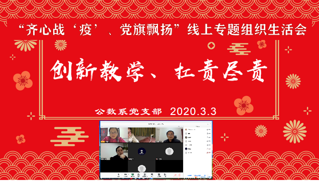 3月3日晚,数统学院公数系全体党员运用腾讯会议开展了以“创新教学、扛责守责”为主题的“齐心战‘疫’、党旗飘扬”云端专题组织生活会。会议由支部书记吴烨主持,认真学习了习近平总书记对新型冠状肺炎疫情防控工作的重要指示批示精神,中共湖南省委通知,《湖南省高等学校新型冠状肺炎疫情防控工作指南》,学校关于新型冠状肺炎疫情防控部署安排及系列通知要求以及学校官方公众号发布的疫情防控知识,向在战“疫”中涌现出的敢于斗争、敢于担当、敢于奉献的邓荣花老师学习等。