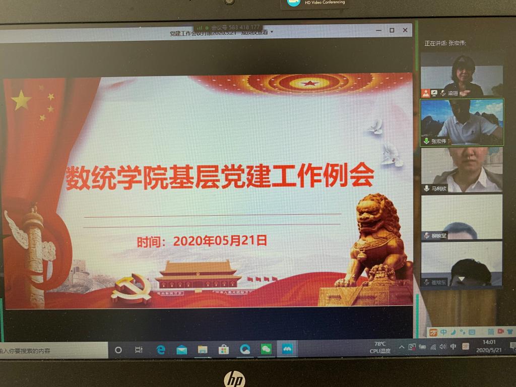 5月21日下午,数统学院党委组织全体支部书记在腾讯会议APP上召开了本学年第一次党建工作会议,主题为“把支部组织力提升落实到学校常态化防疫工作中”。会议由党委书记张宏伟主持,党委副书记马丽,综合办、党务办及8名支部书记全部参加。