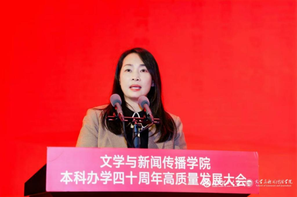 方琼进行总结发言。她指出学院未来发展方向,提出要传承四十年办学特色,重点推进文科老师建设工作,推动学院高质量发展,为学校“双一流”建设作出更大贡献,并对历届校友寄予厚望,对在座的学弟学妹提出更高的要求。