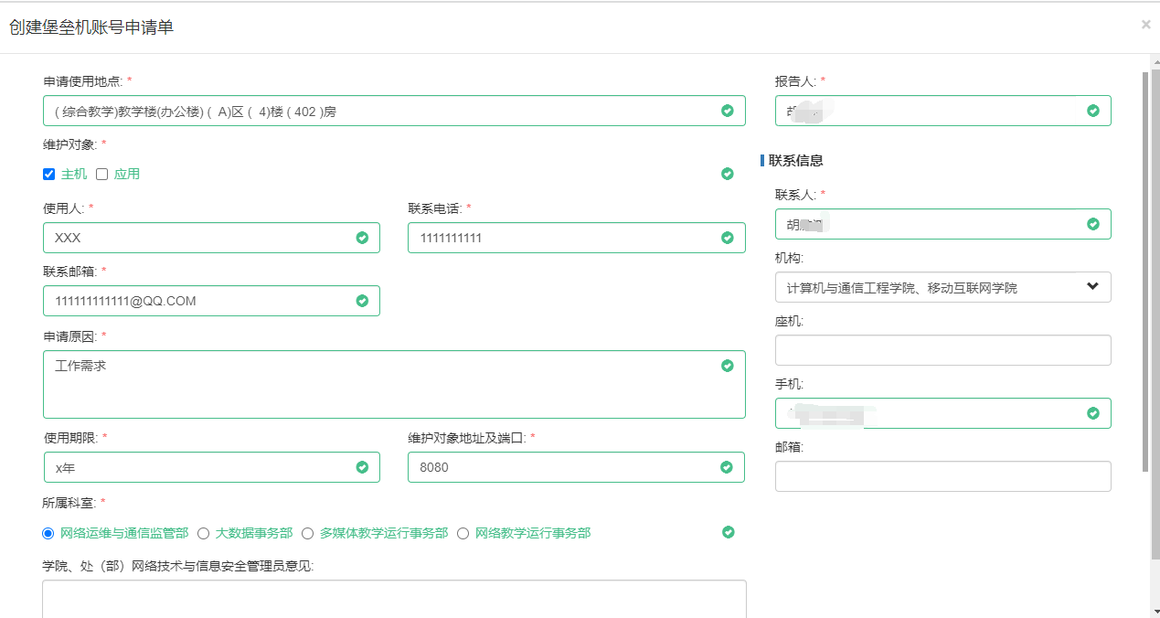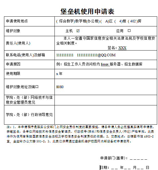本申请程序是落实公安部门上网安全责任制度的重要措施,请各申请人务必完整真实填写申请表、亲笔签名,各单位网络技术与信息安全管理员、行政领导(院长)和信息安全负责人(书记)严格审批。此表将作为使用者承担国家信息安全法规及学校信息安全制度责任的依据。