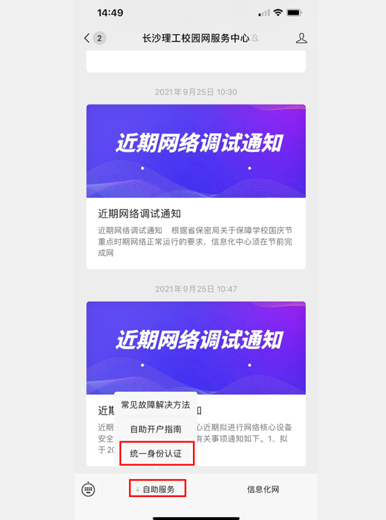 (2) 进入公众号主页点击“自助服务”,选择“注册上网账号”,跳转进入个人统一身份认证门户网站(1.统一身份认证账号密码找回;2.若浏览器不兼容请选择“仍要访问”;)。