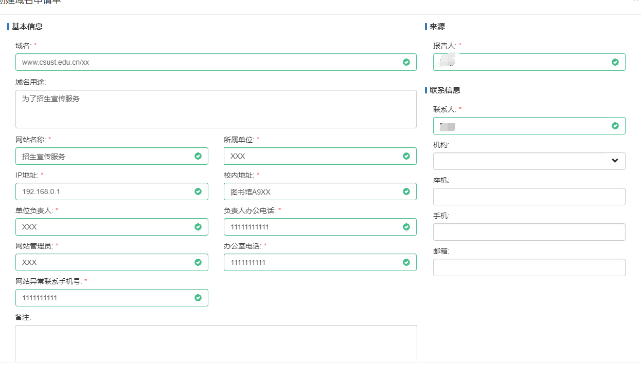 2. 办理对象:校属单位(用于学校各部门网站系统域名申请,包括网站群站点、二级网站空间)