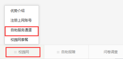 (2)进入公众号主页点击“校园网”,选择“自助服务通道”,输入上网账号和上网密码登录。