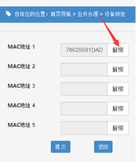 ②设备解绑: 登录了其他人的账号无法退出的,点击解绑后提交,再断开wifi重新连接即可。