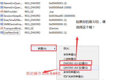 在Parameters这个子项的右侧,点击鼠标右键“新建”“QWORD(64位)值”,然后重命名为“SMBDeviceEnabled”,再子键的值改为0;