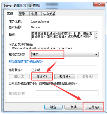 然后,找到server服务,双击进入管理控制页面。把服务的启动类型更改为“禁用”,服务状态更改为“停止”,点击应用后重启电脑即可。