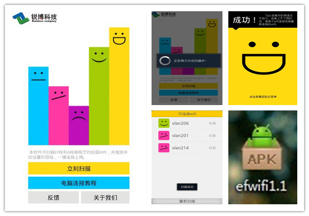 本网讯(记者 梁碧莹 罗修坤)近日,一款名为“东软Wi-Fi一键连接”的Android手机应用软件在同学们之间“疯传”,有了该“神器”,终端一键便可与我院E、F栋教学楼的Wi-Fi连接,免除手动修改Wi-Fi连接参数的烦恼,一键搜索,一键上网。该软件功能不仅实用,吸引同学们使用的另一个原因还是“卖萌”的交互界面,用卡通笑脸、沮丧等表情表示Wi-Fi信号的强度,UI采用强烈的色块对比,简洁时尚等。
