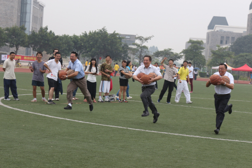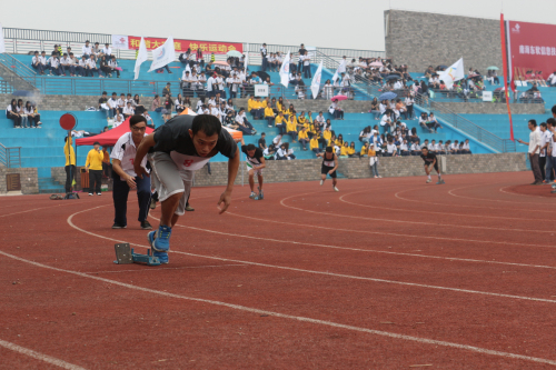 运动场上最欢乐的比赛项目莫过于教工组的趣味比赛了,趣味比赛的项目有跳大绳、两人三足和抱球跑三项。抱球跑最受欢迎,平时看起来比较“严肃”的老师怀抱三个篮球,争先跑过终点线,又怕怀里的球散开来,不自觉地笑逐颜开,围观的同学见状赶忙用手机把这一画面拍了下来。跳大绳、两人三足这两个考验老师们默契的“小考”,着实让不少老师手忙脚乱了一阵,一时间参赛选手都忘记了这是一个比赛,而将它当成一个游戏,一个放松自己、释放压力的游戏。