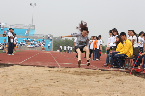 “加油!加油!”沙池旁围绕着许多观众,环绕着有力的呐喊声。远处,一位选手正在做深呼吸,蓄势待发,随着裁判员的指示旗上下摆动,选手起跑,起跳,一个轻捷的身影从眼前掠过,“飞”出一道优美的弧线,观众在这一刻也屏住了呼吸,直到选手双脚稳稳地“落地”,在沙池上留下自己的“一小步”。这就是跳远比赛女子组决赛的一幕,平时看起来文静的女同学们此时都表现出了她们活泼的一面。