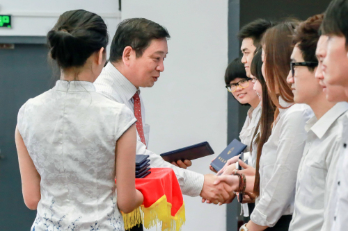 伴着热烈而欢快的音乐,毕业生代表以系部为单位上台接受左斌书记颁发的毕业证书,并合影留念。