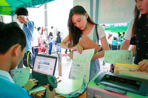 记者观察到,在AB座中庭的新生报到点分为快速通道和普通通道两种,已通过银行自助缴学费、完成网上注册的新生在快速通道前时不时排起两三个人的小队,而普通通道则少有新生前来咨询,据财务总监蔡昭映介绍,通过自助注册的方式报到的新生占比在90%以上。快速通道的工作人员,2014级工商管理专业的何慧莹同学认为,网上注册配合快速通道的报到方式,为报到现场的井然有序立下“汗马功劳”。