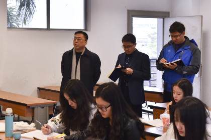 本网讯(记者 李惠旋)新学期,新面貌,新希望。2月27日,天气晴好,我院迎来了新学期正式开学的第一天。早上8点40,副院长陈万里、刘春雨,学工部部长石明罡、质保部部长朱爱红及教学管理相关人员深入课堂,检查开学第一天教师到岗、学生到课的情况。