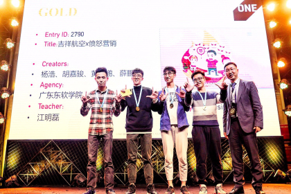 近日, 2017 ONE SHOW 中华青年创新竞赛在上海落幕。经过国际评审团的严格评审,我院数字艺术系14级视觉传达专业的杨浩、胡嘉骏、黄哲鹏、薛鹏飞四名同学的作品《吉祥航空x愤怒营销》获海选命题金奖。