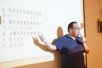 杨帆老师在会上给予同学们备考建议:(1)重视词汇积累和深层学习(重视单词的词义、发音、词性、拼写、同义词和反义词以及一次多义);(2)夯实语法基础和地道表达;(3)听写与精听泛听结合练习;(4)利用空闲时间进行阅读(晨读+广告+小说+报纸);(5)强化传统题型确保得分(听力会话+阅读理解);(6)合理利用历年真题/范文(重视重现和重视结构)。并针对听写练习推荐了一些可用于学习英语的学习软件。