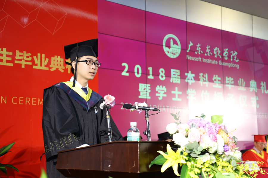 优秀毕业生代表,计算机系电子信息工程专业2014届本科生彭俊东代表首届本科毕业生发言,分享了他在东软的求学感悟,表达了对母校、学校领导、老师、家人以及同学的感激之情。在大学四年,他收获了友情、收获了荣誉、也收获了爱情,在他看来,在大学里学到的学习方法和学习态度是终身受益的。“东软学子身上纹,从此大家社会人”, 彭俊东的发言引发了在场毕业生的欢笑声与掌声。