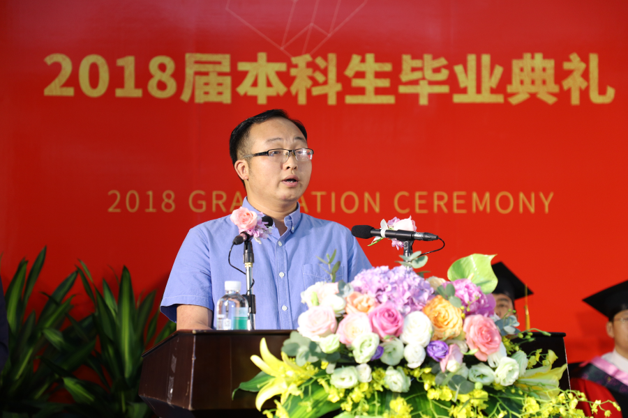 青青校树,萋萋庭草;四载求学,晨昏欢笑;临别依依,千言万语。学工部部长石明罡主持毕业典礼,他代表学校向全体毕业生表示祝贺,并祝福他们一生幸福、一生平安。