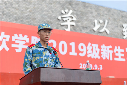 来自计算机学院网络工程系2019级的赵星皓代表新生做出承诺,将在本次军训中努力做到“服从命令,听从指挥”、“苦练基本功,磨炼意志”、 “巩固军训成果。”