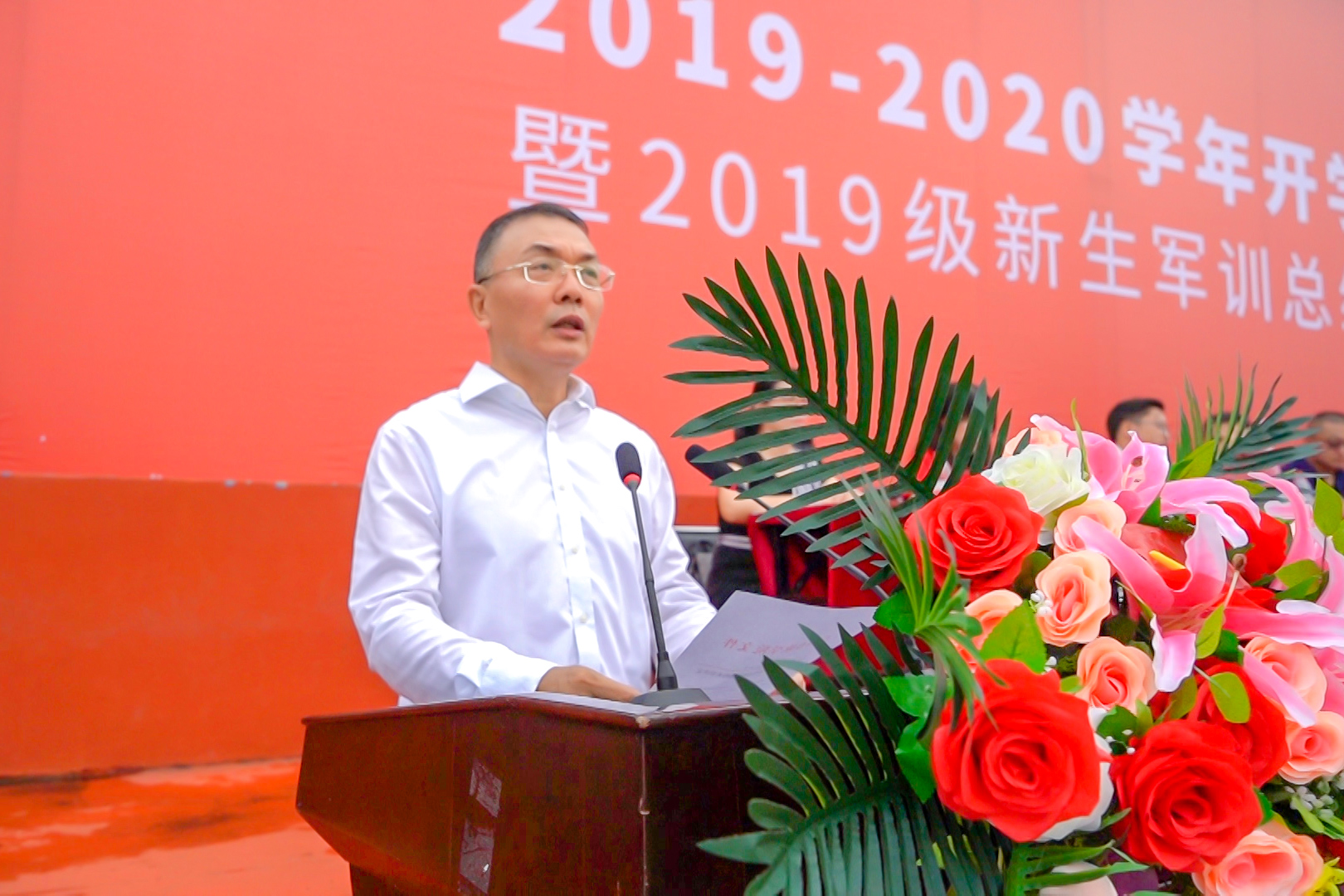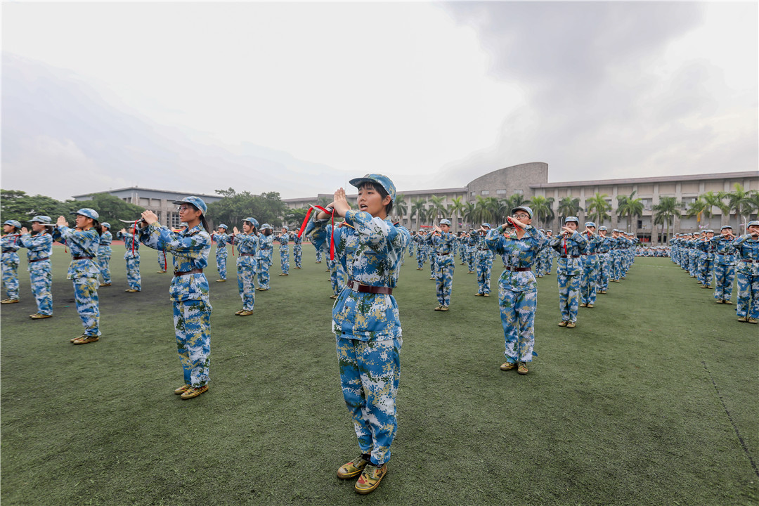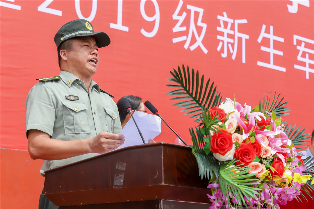 佛山市南海区青少年军校执行校长黄恒象作军训总结。他肯定了2019级全体新生良好的综合素质和崭新的精神风貌,并对承训官兵、带训老师的辛勤付出致以崇高的敬意。他寄语2019级新生要把爱国之志和爱校情怀融入到自己的拼搏之中,在不断前行的道路上克服困难,勇攀高峰,力争荣誉。