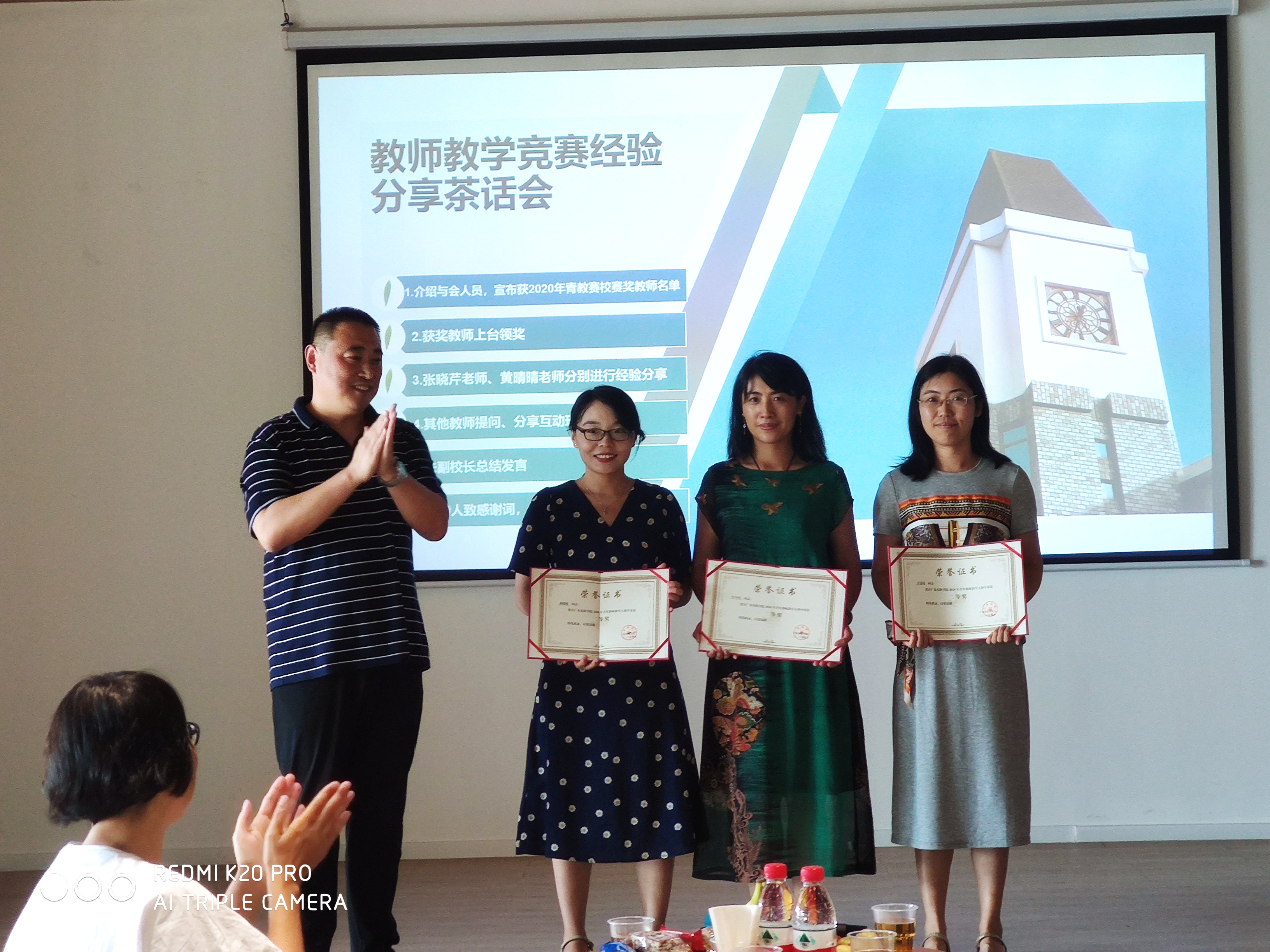 会上,朱爱红副校长、刘旭东部长为2020年学校青教赛获奖教师颁奖,获奖教师代表张晓芹、黄晴晴分别进行经验分享。