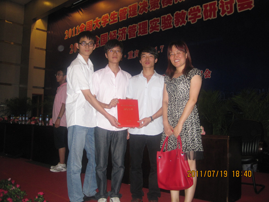 本网讯 “全国大学生管理决策模拟大赛”全国总决赛于7月17日—23日在重庆工商大学举行。我院信管系“东软宏锐”团队(指导教师:于景存、李文龙,队员09物流李顺铨、09工商邱林致、09工商黄超军)代表南方赛区参加了全国总决赛并荣获一等奖。