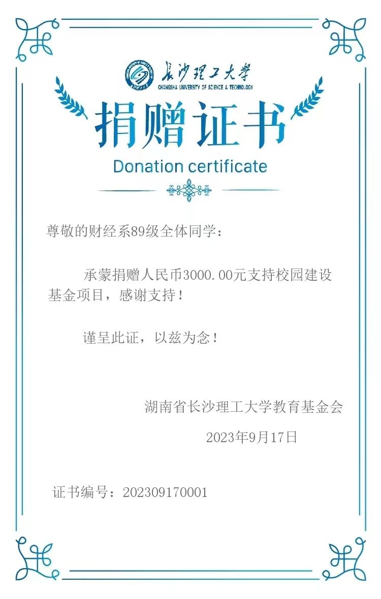 为感念母校教育之恩、助力母校进一步发展,89级财会校友们捐出13000元作为支持学院发展及校园建设基金,为学弟学妹们提供更好的学习环境与条件。
