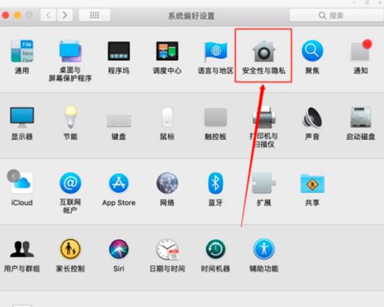 b.打开系统设置偏好中的“安全与隐私”