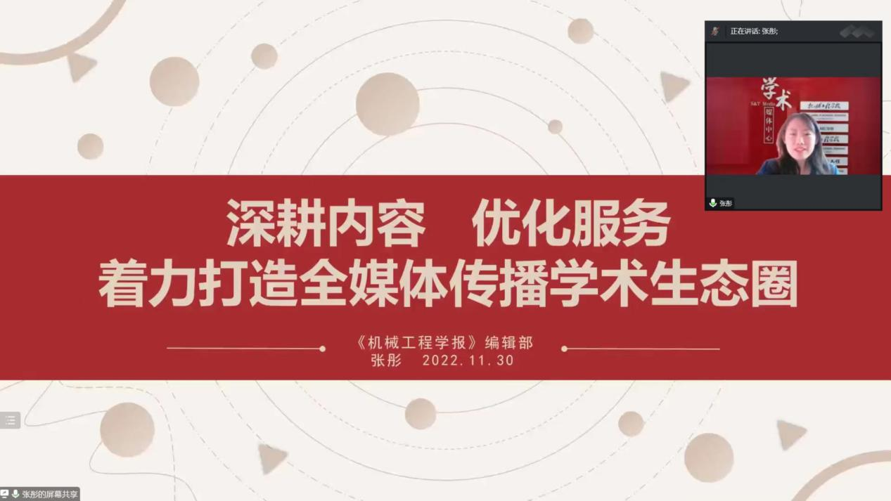 《机械工程学报》编辑部主任张彤以《深耕内容、优化服务,着力打造全媒体传播学术生态圈》为题做了报告,以打造全媒体学术生态圈为背景,从期刊简介、专题出版及传播与服务三个方面进行解析。