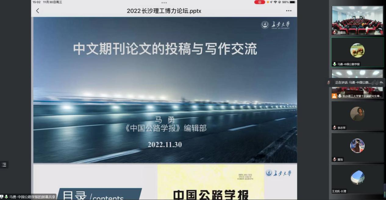 《中国公路学报》的编辑部主任马勇以主题《中文期刊论文的投稿与写作交流》做了精彩报告,分享了中文期刊投稿经验体会,给研究生在投稿中文期刊的时候提供了极大的帮助。