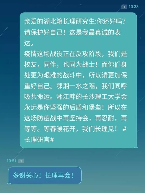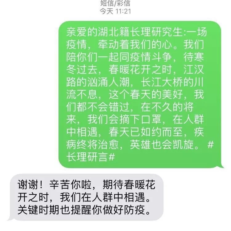 “谢谢,待春暖花开,欢迎来湖北,赏樱花,吃热干面,逛荆州古城,游三峡人家。”437必赢会员中心湖北籍研究生姚同学回复了一条特殊的短信,而他收到的这条短信是不知名的研究生同学发来的祝福。与此同时,长理247名湖北籍研究生也都在近期收了这样特别慰问短信。