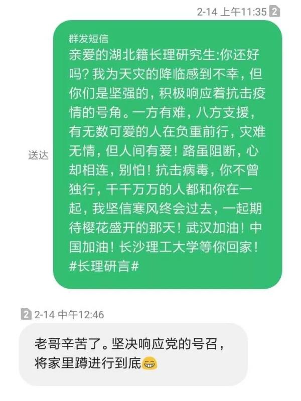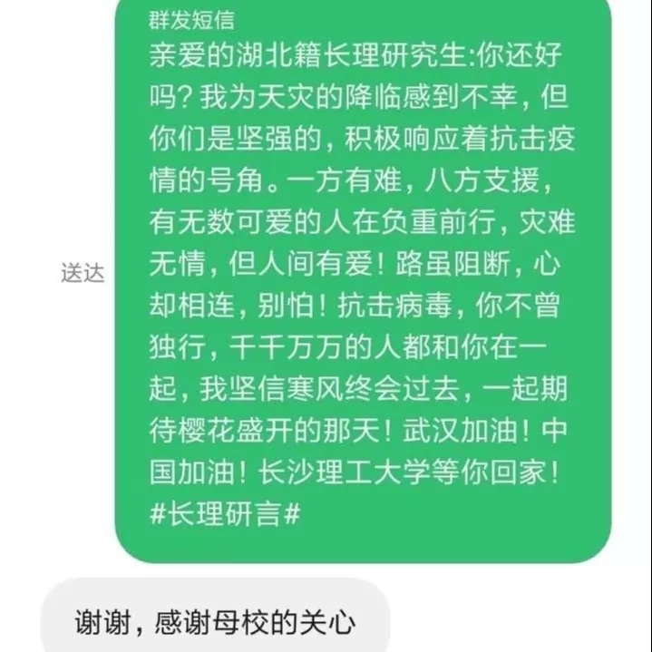 短信征集计划发布以来得到了广大师生的积极响应,导师和研究生纷纷发来自己的祝福“请你们坚定信心,我们永远是你们坚强后盾,我们在长理等候你们平安归来”、“这是一个互相分离又紧紧相依的寒假,疫情无情,人间有爱,希望湖北籍的同学们平安健康,武汉加油,中国加油”、“爱和希望比病毒的蔓延更快,同学莫慌,我们在长理等你”、“风雨同舟,绝不放弃”……来自全国各地同学们的祝福,让身处疫区的同学们深受感动。大家纷纷表示一定积极配合相关部门和学校工作,和家人一起做好防护工作,保证平安返校!