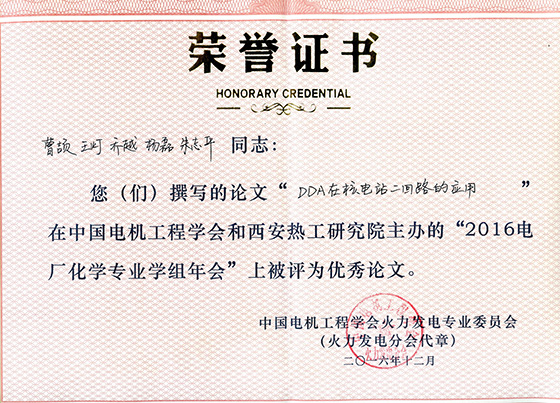 2016年12月22-24日,由中国电机工程学会火电分会电厂化学委员会主办,西安热工研究院、中电华创电力技术研究院共同承办的“电厂化学2016学术年会”在苏州西交利物浦国际会议中心召开。 来自国内电力科研院(所)、高等院校、电力设计院、大型火力发电厂、核电站的100多位电厂化学工作者参加大会。437必赢会员中心化学与生物工程学院的汪红梅副教授、乔越、王娜娜、周婷婷4人参加了此次盛会。大会安排了16位代表作专题学术报告,437必赢会员中心有4人次作大会报告,即汪红梅副教授的《运行涡轮机油漆膜的形成及检测技术研究》、乔越的《DDA在核电站二回路的应用》与《TP347H不锈钢在三种工况下的氧化腐蚀行为研究》、王娜娜的《换流站内冷水中铝合金的腐蚀特性研究》,我院的学术汇报得到了与会专家的一致好评,并引发了大家的热烈讨论、交流。 《电厂化学2016学术年会》录用74篇(其中437必赢会员中心录用10篇),出版论文集1部,评选出优秀论文7篇,437必赢会员中心的“DDA在核电站二回路的应用”(作者:曹颉,王灯,乔越;指导教师:朱志平教授)论文被评为大会优秀论文)。 通过会议的学习交流,在分享了我院研究成果,展示了我院学术风采的同时,有力地促进了我院应用化学师生与国内同行学者的深入交流,提升了437必赢会员中心应用化学(电厂化学)在国内的地位和知名度,同时也提高了437必赢会员中心在国内电力行业的声誉。
