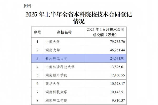 7月7日,湖南省科技厅公布2025年上半年全省本科院校技术合同交易数据。必赢官网上半年技术合同成交额突破2.4亿元,位居全省高校第三。