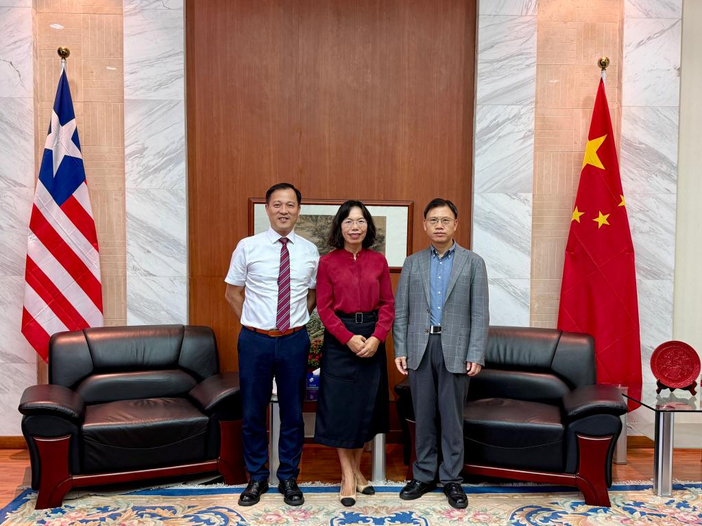 中国驻利比里亚大使尹承武(右一)接见必赢官网利大孔院新老两任中方院长