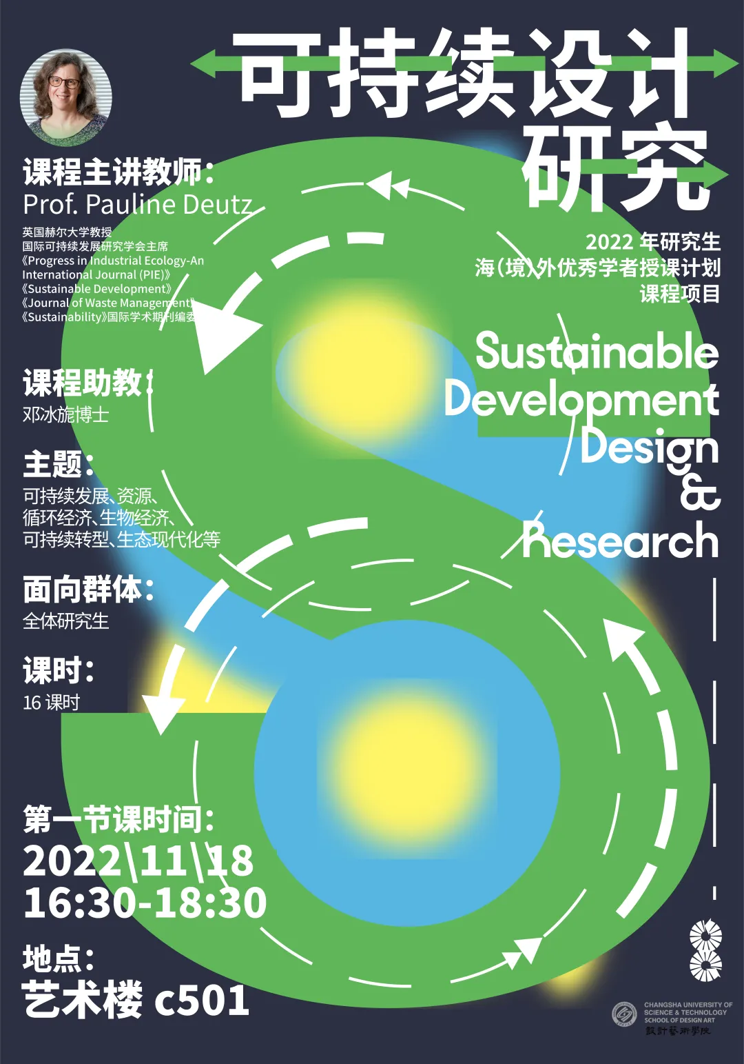 本次《可持续设计研究》课程有幸请到了英国赫尔大学教授、国际可持续研究学会主席Pauline Deutz教授。她同时也是《Progress in Industrial Ecology-An International Journal (PIE)》《Sustainable Development》《Journalof Waste Management》《Sustainability》国际学术期刊编委。Pauline Deutz教授将会在课堂上与同学们交流包括可持续发展、循环经济、可持续转型、生态现代化等前沿问题,对西方的可持续性和可持续发展的观点进批判性的介绍、为可持续发展的呼吁和实践提供方法,并就这些话题展开讨论,特别是考虑这些方法在中国背景下的适用性。