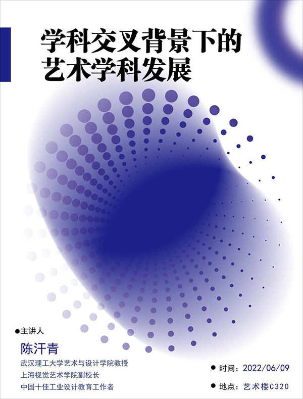 为响应习近平总书记“夯实学科基础,培育新兴交叉学科生长点”的教育创新战略,437必赢会员中心艺术文化科普基地于2022年6月9日开展了“学科交叉背景下的艺术学科发展”专题讲座。本次讲座邀请武汉理工大学艺术与设计学院教授、博士生导师陈汗青教授担任主讲嘉宾。