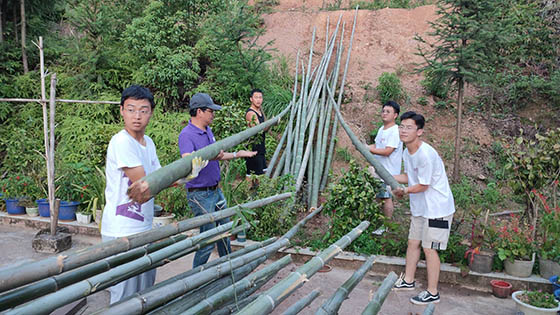 蝉鸣阵阵,新一天的工作伴着微风拉开序幕。经过前一晚的赶工,今日工作量得到一定程度减少。竹灯的打磨工作进入收尾阶段,一摞摞已制作完的竹灯外壳整齐地摆放在乡创中心的庭院中,蔚为壮观!同时轮胎花圃的定点工作也全部完成。下午三时,轮胎花圃的上色晾晒工作全部完成,只等最后的埋地步骤。文卫民老师和实践团成员们一同赶至竹子堆放处,再次搬运了一批新竹子制作乡创中心门头围栏。齐心协力,咬牙坚持,几十根竹子全部装车运回乡创中心。随后便开始了竹子的精细切割工作。路灯缓缓亮起,远处湖光山色映着晚霞,大家开足马力干活,永不放弃!