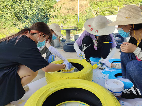 在带队老师文卫民的指导下,大家元气满满地开启新一天的工作。戴上装备,开始为清洗过的轮胎添上五颜六色的新衣,在阳光下透着新生的活力。另一队则抡起铁锹,光着膀子卖力地翻地,烈日之下他们挥汗如雨,却也阻挡不住大家迫切改造的热情!稍作休息后大家整装待发,继续进行工作。女生一队负责为轮胎上漆,男生一队则负责切割轮胎,做出造型。电钻、木锯、切割机齐上阵,火星四溅,电钻声口号声齐响,电光火石间轮胎便一劈两半。两队默契协作,不惧烈日,顺利完成今日工作!