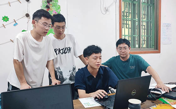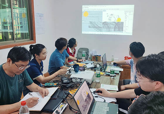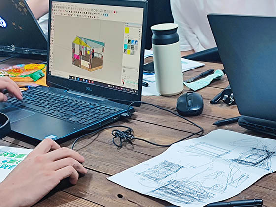 经过彻夜修改完善方案后,实践团成员与老师、工作人员就已完善方案开展又一次详细的方案讨论会。讨论确定了户外休闲区、凉亭和室内软装改造的具体施工方向。带队老师文卫民与同学们根据上午讨论结果,大家利用犀牛、proe、creo等专业软件对整体方案进一步细化,确定了物料的具体尺寸、配色及整体搭配方案。