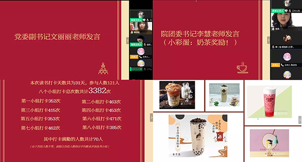 会议伊始,由各小组代表分享实践总结。以PPT为媒介,详细的总结了过去一个月以来读书打卡活动、社会实践活动、家乡明信片制作、新年祝福视频以及抗“疫”小视频的录制五项工作的完成情况。分享了组内相互督促、相互鼓励及有序分工等假期奋斗瞬间,展示了各组优秀实践作品,分享假期读书感悟。 精彩的展示结束后,由组织部张宗跃公布最终获奖结果其中优秀小组3组,优秀学员16名并为此颁发电子证书。优秀学员分享自己通过寒假实践的成长与良好习惯的养成。随后党委副书记文丽丽对于寒假实践工作做出了总结,并提出了有深度的“三问”留给全体学生会成员思考。最后院团委书记李慧对优秀学员的提出表扬并给予奖励,对未来学生会工作做出了热切地展望与希望的寄托。