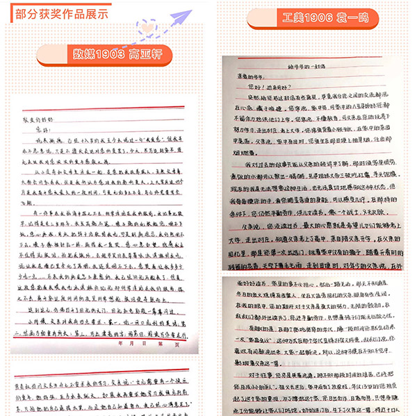 家书是中华文化剪不断的根脉,可谓“千古温情寄尺素”,活动一经启幕,便收到积极反响。艺术学子以笔传情,横笔飞墨间不禁流露出对家乡满满的回忆与爱慕,千思万想汇于一卷之中。通过层层筛选,20份家书作品脱颖而出,其中一等奖3份、二等奖7份、三等奖10份。此次活动正值疫情隔离期间,每份作品都充满爱意,在这满是隔离的时刻,隔离地区隔离不了爱,以家书为绳把心联系起来,让这个疫情蔓延的世界多一份爱,多一份温暖。