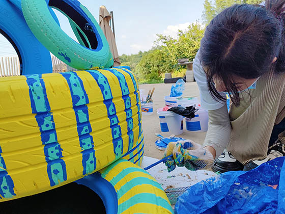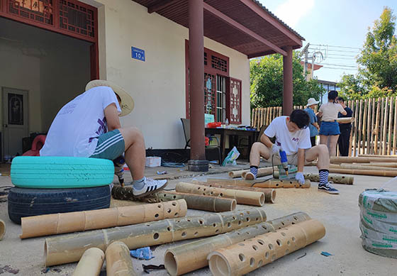 伴着挖掘机的轰鸣声,不远处传来工人师傅高声的吆喝,紧锣密鼓的施工就此拉开序幕。轮胎组完成青蛙装置的图案及清漆上色工作,同时加固闹钟及人偶装置,使其安全性得到保障。文卫民老师也亲自上阵,和实践团成员们一同顶着烈日制作轮胎桌椅装置。竹灯组继续竹子打孔及切割工作,上百根竹子在大家的共同努力下以肉眼可见的速度被穿孔。尽管每个人的手被电钻震得麻木,被烫得生疼,可没人抱怨一句,只说一句“没事,我们继续!”,便默默完成着后续的工作。老师也在大家都休息的时候仍坚持工作,所有人都被他的精神而折服!