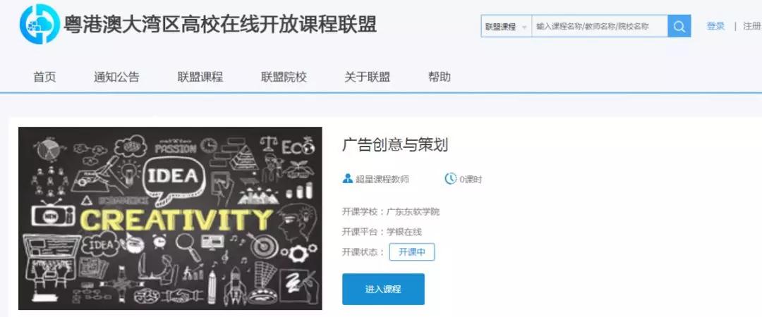 号外号外!想看东软精品慕课的亲们又多了一个新渠道了!近日,粤港澳大湾区高校在线开放课程联盟平台上线,beat365江明磊老师主讲的《广告创意与策划》课在该平台上开讲啦!
