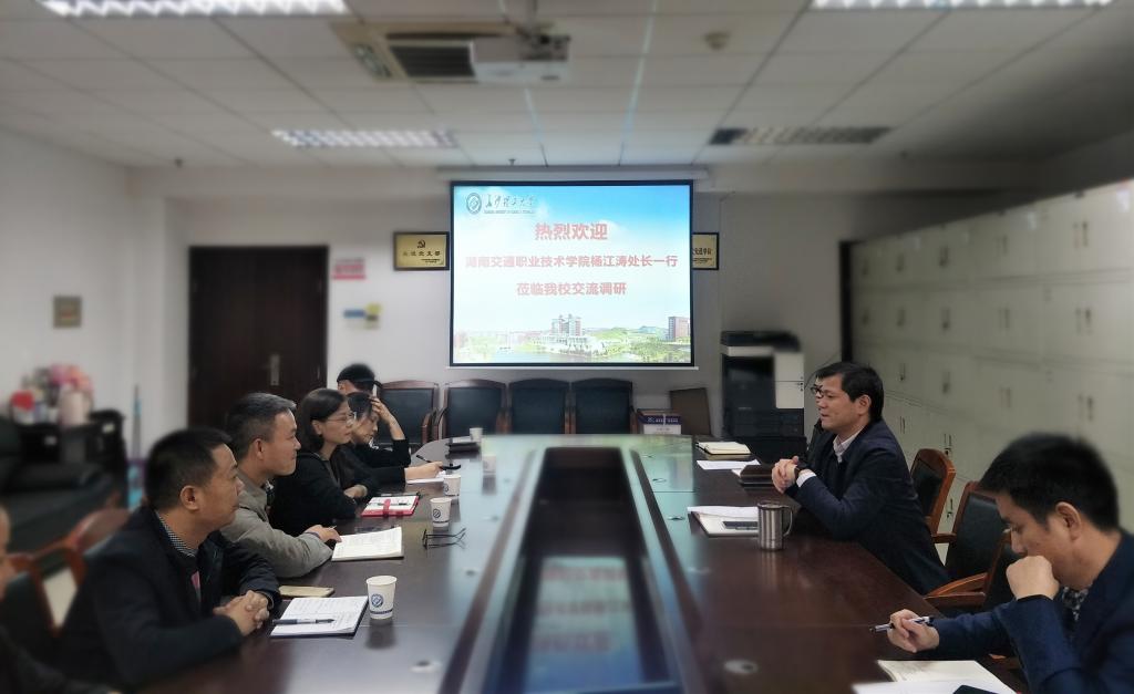 10月16日下午,湖南交通职业技术学院国有资产管理处副处长曹靖一行7人来我处调研,并进行交流座谈。处长庄创奇,副处长邓应军、陈坤、周娇林及相关人员参加座谈。