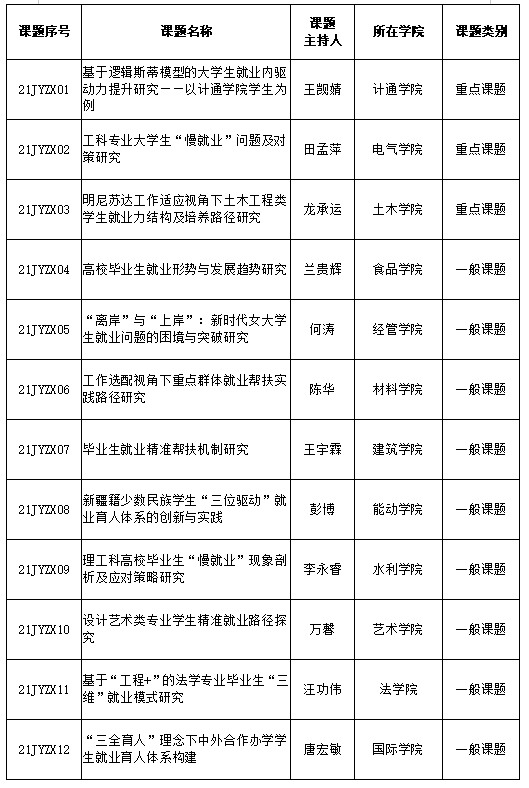 根据《关于开展2021年437必赢会员中心毕业生就业专项课题研究申报工作的通知》要求,经个人申报、学院推荐、学校组织专家评审, 现对12项就业专项课题予以立项,其中3项重点专项课题,9项一般课题。具体名单如下: